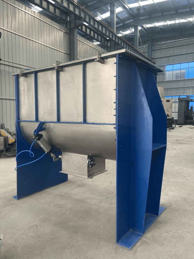 LA MEZCLADORA DE CINTA DE ACERO AL CARBONO DE 80 PIES CÚBICOS consta de un canal horizontal en forma de U y un agitador doble especialmente fabricado. El agitador doble consta de un agitador en espiral interior y otro exterior. El agitador de cinta exterior mueve el material en una dirección y el agitador de cinta interior mueve el material en la dirección opuesta.