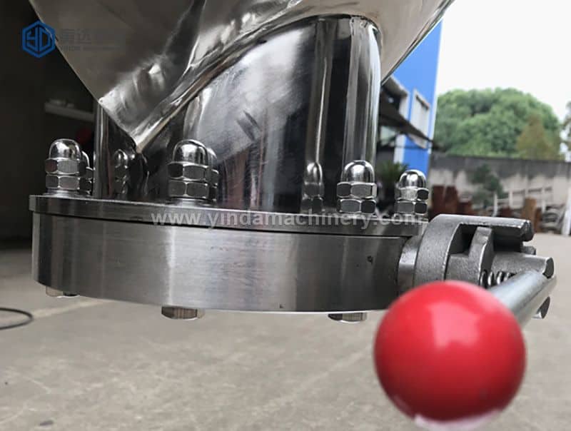 O corpo da máquina de mistura é soldado por dois cilindros em forma de V, entrada para um dispositivo de travamento rápido, a porta de descarga é uma válvula borboleta manual, operação simples e rápida. Eixo de agitação forçado fixo pela produção de tubos de aço sem costura de aço inoxidável sanitário, o corpo principal é fixado nas duas extremidades da parte superior da manga do cilindro, através do movimento relativo e do cilindro de mistura, para que o material tenha efeito de rotação forçado, melhore a uniformidade da mistura .